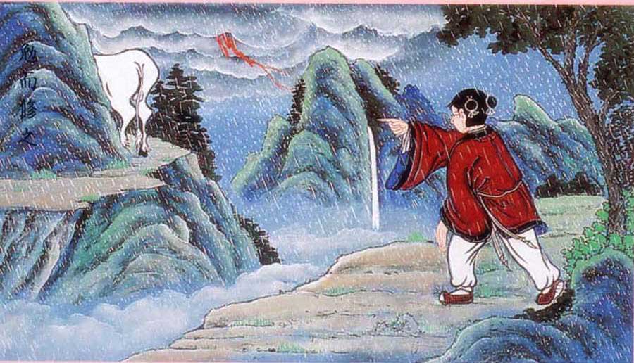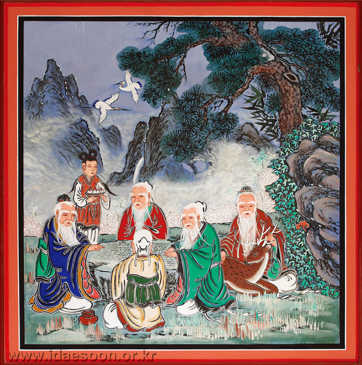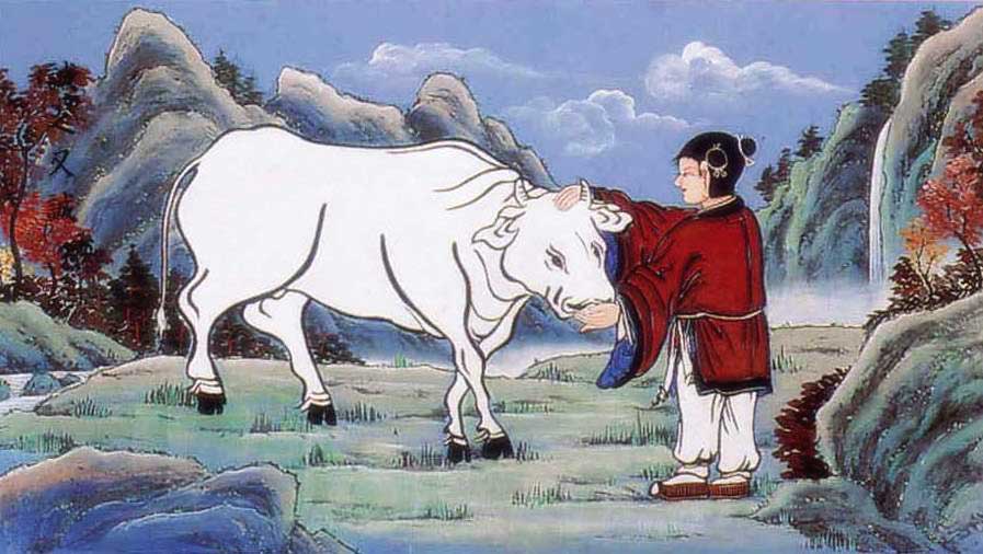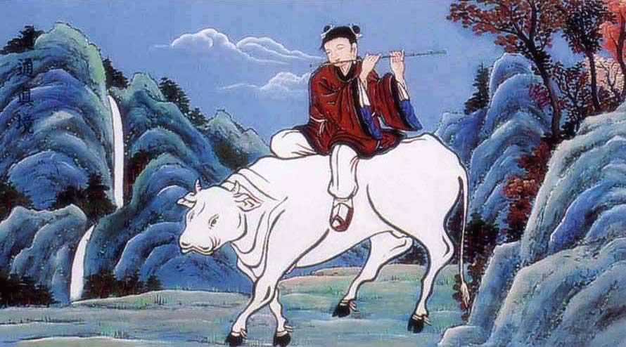 The child is in a tranquil and serene state as he rides the white ox while playing his flute. This represents both a mental state and an experientially learned mode of being which embody the realization 'Dao is me and I am Dao,' and this signifies that the child has arrived upon perfected union with Daesoon Truth. The season in the background is obviously autumn, and thereby indicates that his cultivation has come to the full fruition.