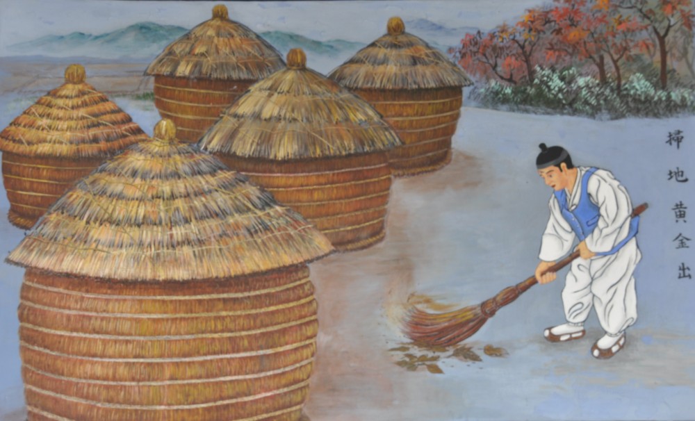 This title literally means 'Sweep the ground, and gold will be found.' This wording was used by our forebears who wrote it on paper and pasted it up on the front door of the house on the Initial Day of Spring. The person in the wall mural is shown to sweep up the ground and collect the rice plants that had been dropped into the ground after threshing the rice. The meaning here is that if Dao practitioners make diligently cultivating themselves to hone and purify their bodies and minds into a daily practice, then, in the end, they will gain the 'gold' of happiness and blessings.