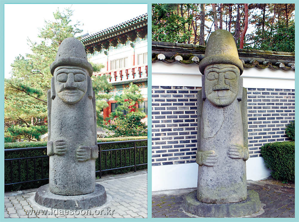The Hall of Drawing in Heavenly Energy :Bonggangjeon building was used as the Main Sanctuary Building before the current one was built. In the front, there are candle sticks, incense burner, and a pair of Haetaes, heavenly lions. In the yard, there is water fountain and another pair of Haetaes. Candle sticks and incense burners are used when we make offering or perform devoted services to divine beings. Therefore, what those items which are placed in front of the building imply is that great deities are enshrined in this building. Therefore, these items are placed in front of the Main Sanctuary Building and this Bonggangjeon both of which house shrines.![]()