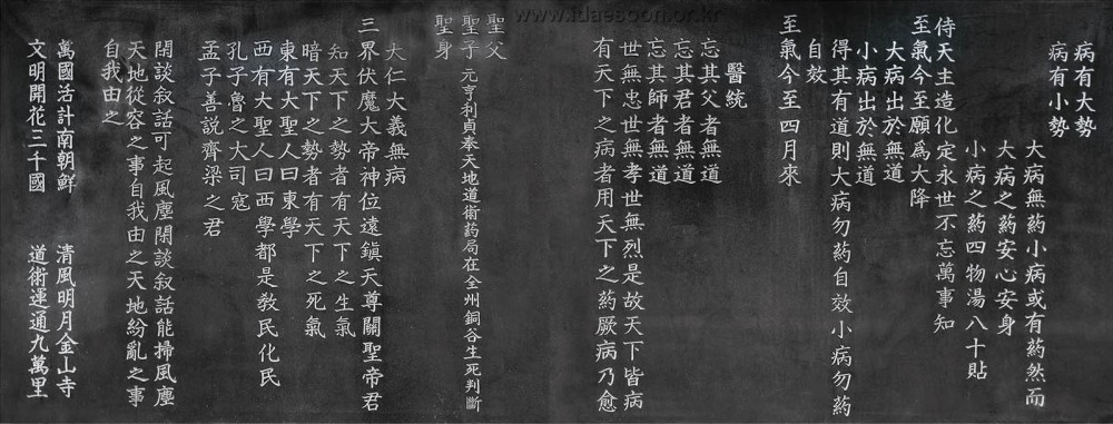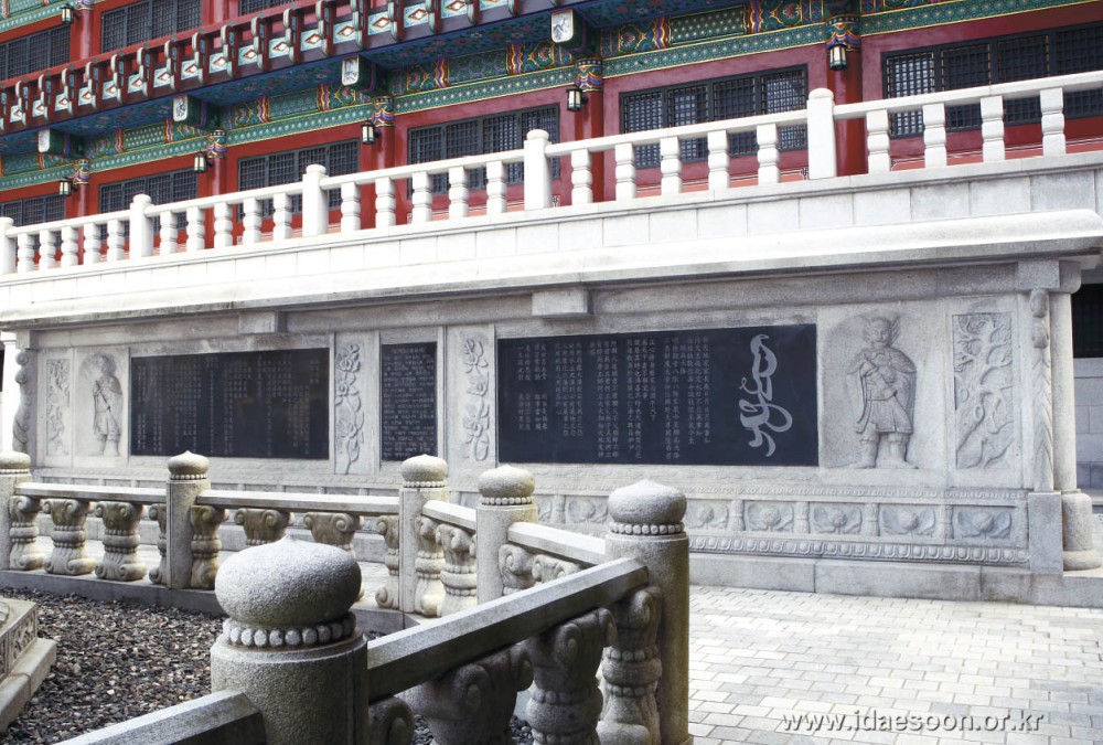 In this stone screen, there are inscriptions of explanation on Cheonggye Tower. And Sangje's Byeongsaemun (a diagnostic statement for the diseased state of the world) which describes the reasons why this world was devastated by so many miseries and cruelties and was eventually on the brink of annihilation. And it includes Sangje’s specific diagnosis or treatment to heal the diseased world and save the people afflicted by misery. Furthermore, there are also some of His poems that contain sacred teachings.![]()