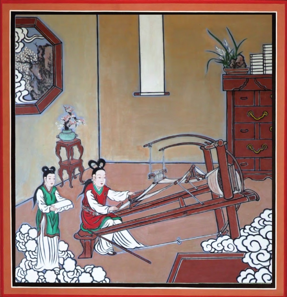 This painting depicts celestial maidens weaving silk fabric.