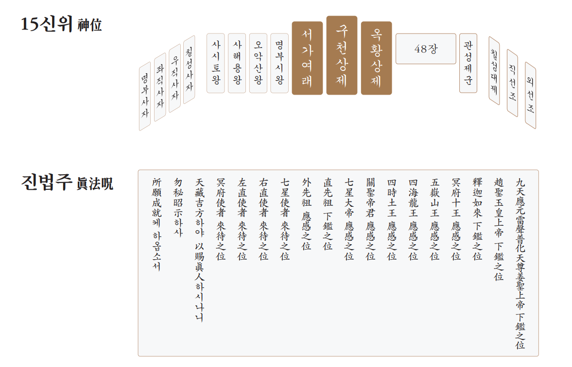 1) The first category is the Principle Holy Position (Wonwi) which includes the Supreme God of the Ninth Heaven (Kang Jeungsan), the Great Jade Emperor (Lord of the Dao Jo Jeongsan), and Shakyamuni Buddha.2) The second category is the Second Holy Position (Jaewi) which includes the Ten Judge Kings of the Postmortem Precincts (ten spiritual kings who judge human souls in the afterlife), the Five Mountain Kings (the five spiritual kings in charge of the mountains in five directions of Earth), the Four Ocean Dragon Kings (the four spiritual dragon kings in charge of the four seas), and the Terrestrial Kings of the Four Seasons (the four spiritual kings in charge of the four seasons).3) The third category is the Third Holy Position (Samwi) which includes the Sage-emperor and Martial Commander Lord Guan Yu (Chinese general Guan Yu, the heavenly Sage-emperor protecting against evil spirits or demons), the Great Emperors of the Seven Stars (the seven spiritual kings in charge of human lifespan and fortune), Paternal Ancestors, and Maternal Ancestors.4) The fourth category is the Fourth Holy Position (Sawi) which includes Messengers of the Seven Stars (the messengers who aid the Great Emperors of the Seven Stars), Right-flanking Messengers (the messengers who aid the Messengers of the Seven Stars), Left-flanking Messengers (the messengers who aid Messengers of the Seven Stars), and Messengers of the Postmortem Precincts (the psychopomps who guide newly arrived souls in the afterlife).